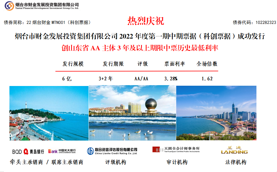 10月20日,集团2022年度首期中期票据(科创票据)成功发行!发行规模6亿元,期限3+2年,票面利率3.28%,全场认购倍数1.62倍,创山东省AA主体3年及以上期限中票历史最低利率,同时也是山东省首笔基金类科创票据,烟台市首笔用途类科创票据。本期债券发行由青岛银行牵头主承,光大银行联席主承,联合资信、天圆全会计师事务所及兰迪律师事务所分别提供信用评级、审计和法律服务。