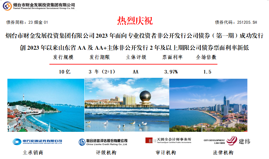 6月6日,谈球吧集团2023年面向专业投资者非公开发行公司债券(第一期)成功发行。本期债券发行规模10亿元,期限3年(2+1),票面利率3.97%,全场认购倍数1.5倍,集团作为AA主体,创2023年以来山东省所有AA、AA+主体非公开发行2年及以上期限公司债券票面利率新低,且票面利率低于山东省2023年以来同级别、同期限非公开公司债253BP以上。本期债券发行由申万宏源证券有限公司主承,联合资信、天圆全会计师事务所及建纬律师事务所分别提供信用评级、审计和法律服务。