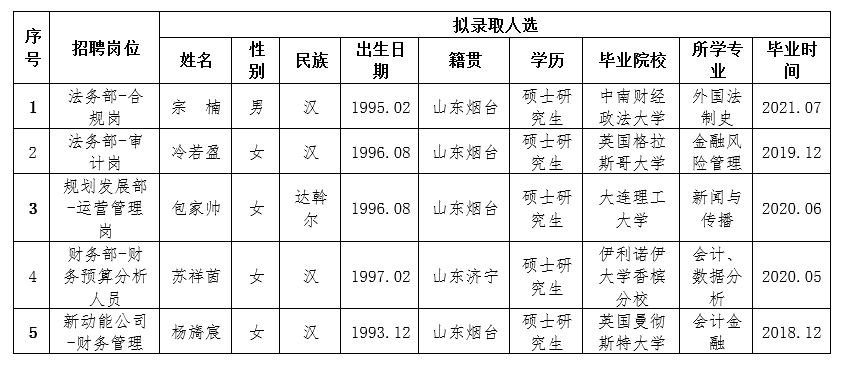 按照2020828日发布的《2020年谈球吧集团面向双一流和全球TOP200高校毕业生公开招聘简章》相关规定,经过简历收集、资格审查、初试、复试、集体决策等环节,拟确定部分岗位录取人选(详见下表),现予以公示,公示期为5个工作日(929日至1013日)。公示期间如有异议,请与谈球吧联系,电话:0535-6887256