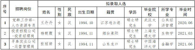 按照2020年8月28日发布的《2020年谈球吧集团面向“双一流”和全球TOP200高校毕业生公开招聘简章》相关规定,经过简历收集、资格审查、初试、复试、集体决策等环节,拟确定部分岗位录取人选(详见下表),现予以公示,公示期为5个工作日(11月10日至11月17日)。