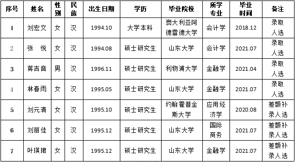 公示期结束无异议后,公司将优先与四名录取人选签订劳动合同或进行网签,如录取人选在规定时间内,因个人原因未与公司签订劳动合同或进行网签,公司可从差额补录人选中,根据成绩排名,按照表中顺序依次进行递补。