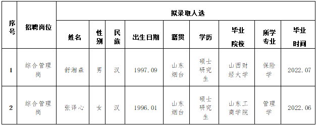 按照集团7月11日发布的招聘公告,经简历投递、资格审查、笔试、面试、集体决策等环节,拟确定部分校招岗位录取人选,现予以公示,公示期为5个工作日(8月1日至8月5日)。本次公开招聘岗位中综合管理岗已招满,此岗位招聘终止。